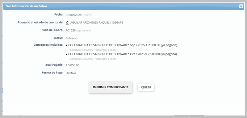 Si selecciona el número de folio visualizará los elementos que incluyen el cobro: